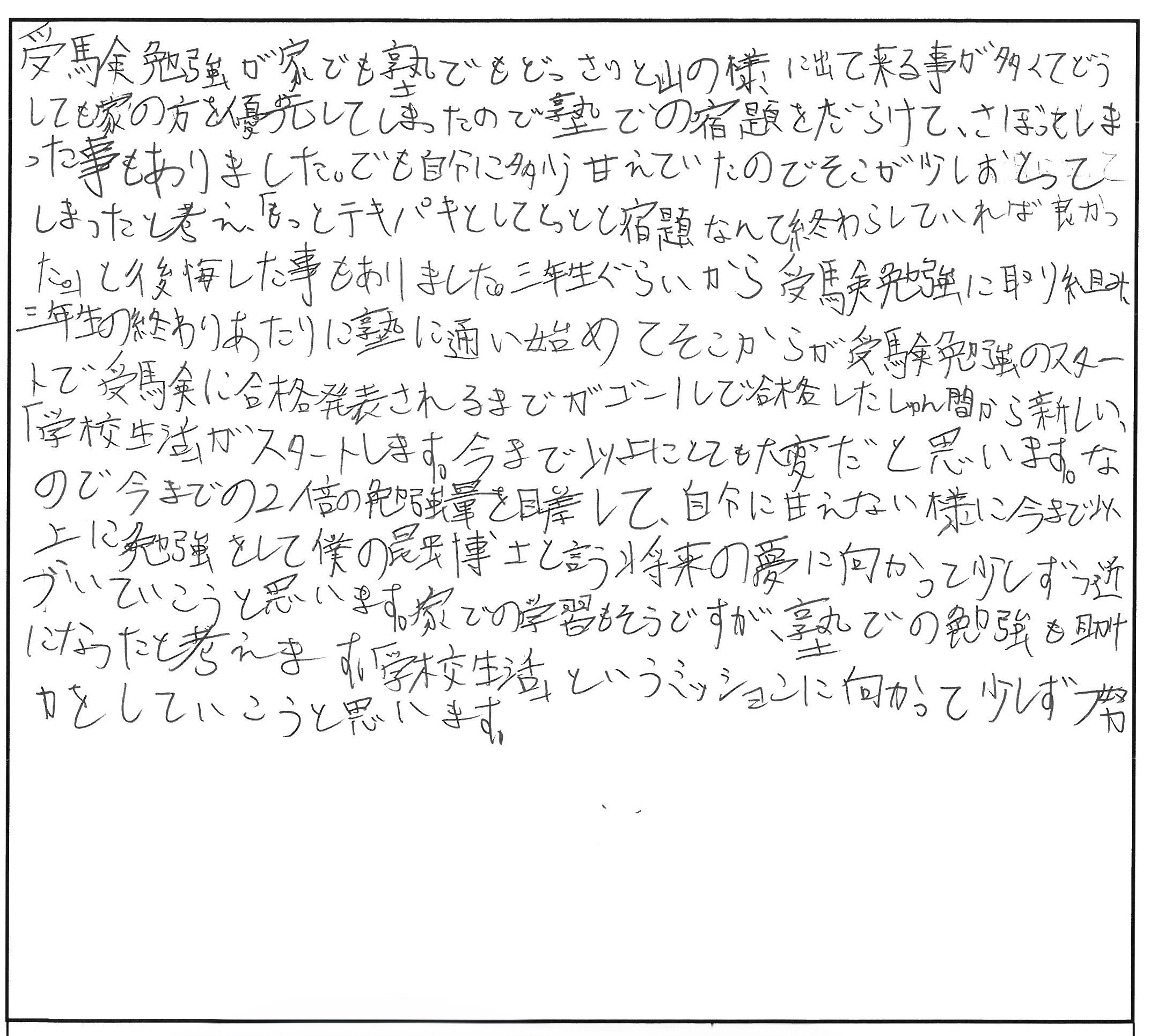 受験勉強が家でも塾でもどっさりと山の様に出て来る事が多くてどうしても家の方を優先してしまったので、塾での宿題をだらけて、さぼってしまった事もありました。
