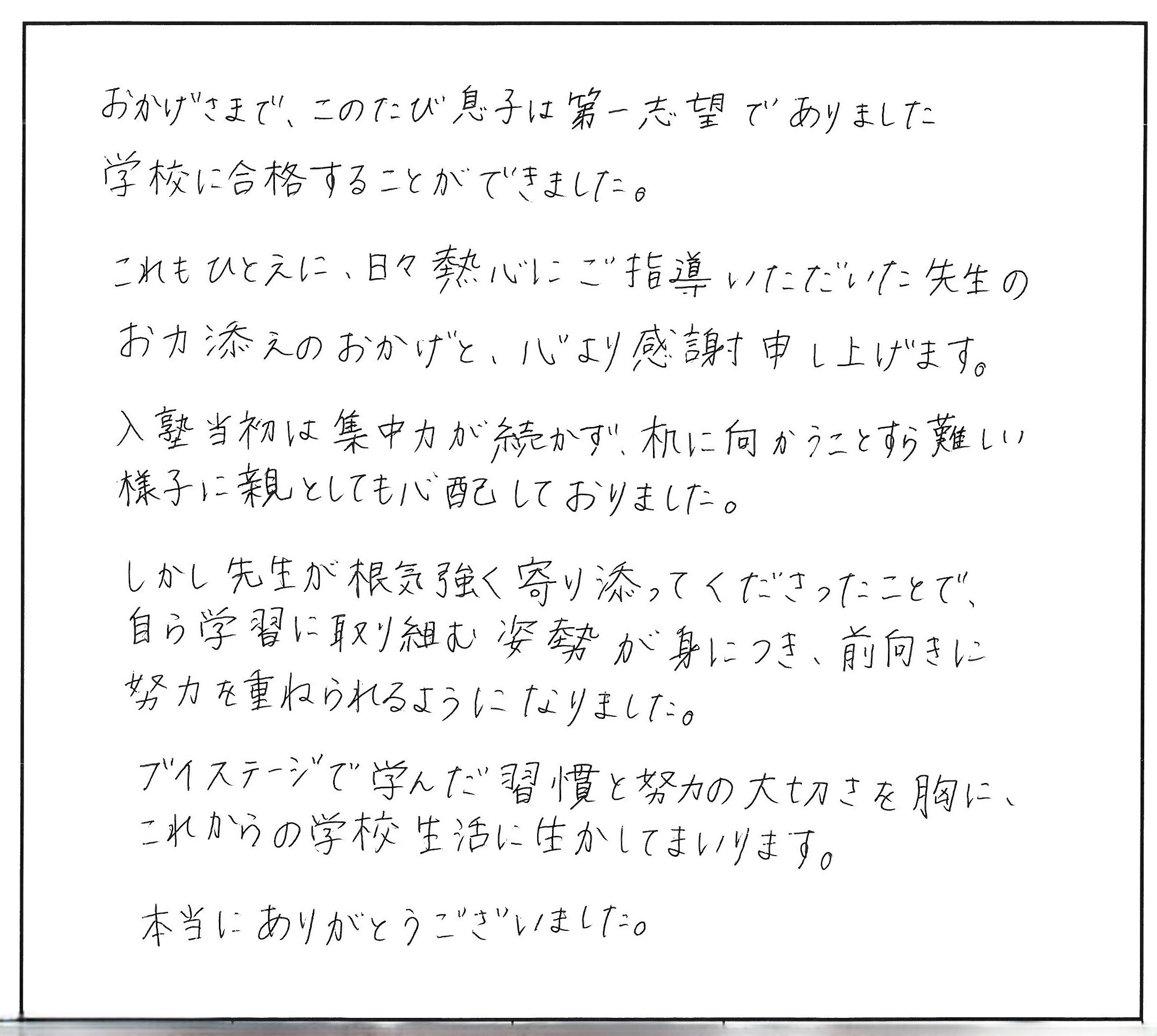 おかげさまで、このたび息子は第一志望でありました学校に合格することができました。